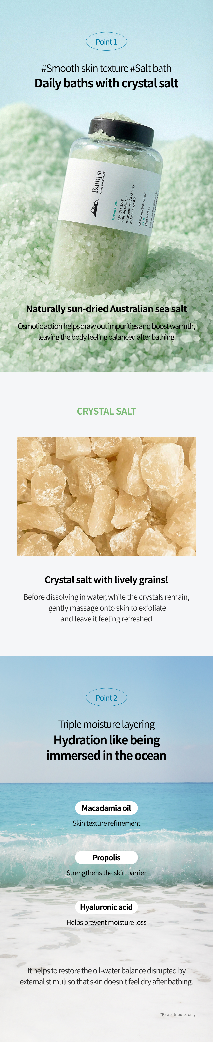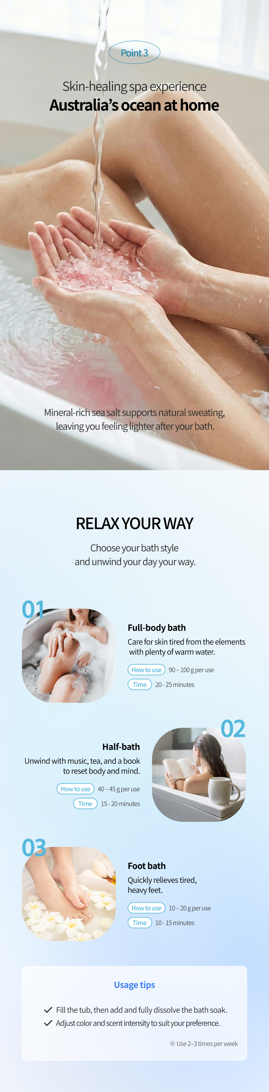 - Gentle exfoliation : Soft salt crystals for a light pre-dissolve massage