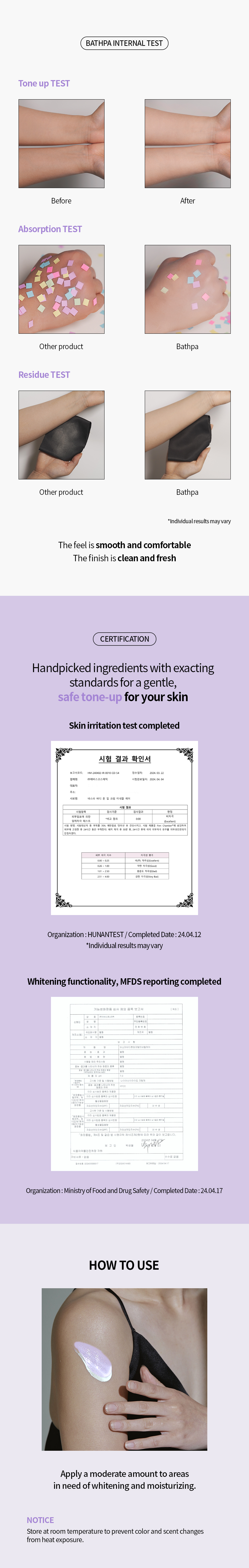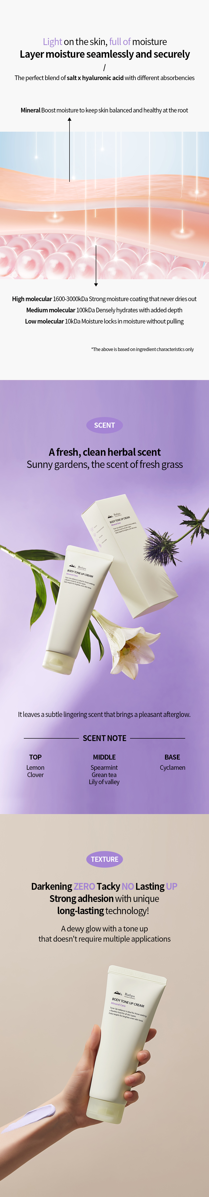 - Moisturizing : Salt Iysate, Hyaluronic acid
