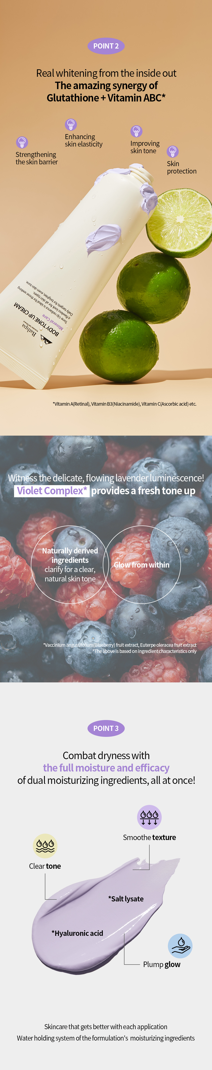 - Whitening : Glutathione + Vitamin ABC, Violet complex