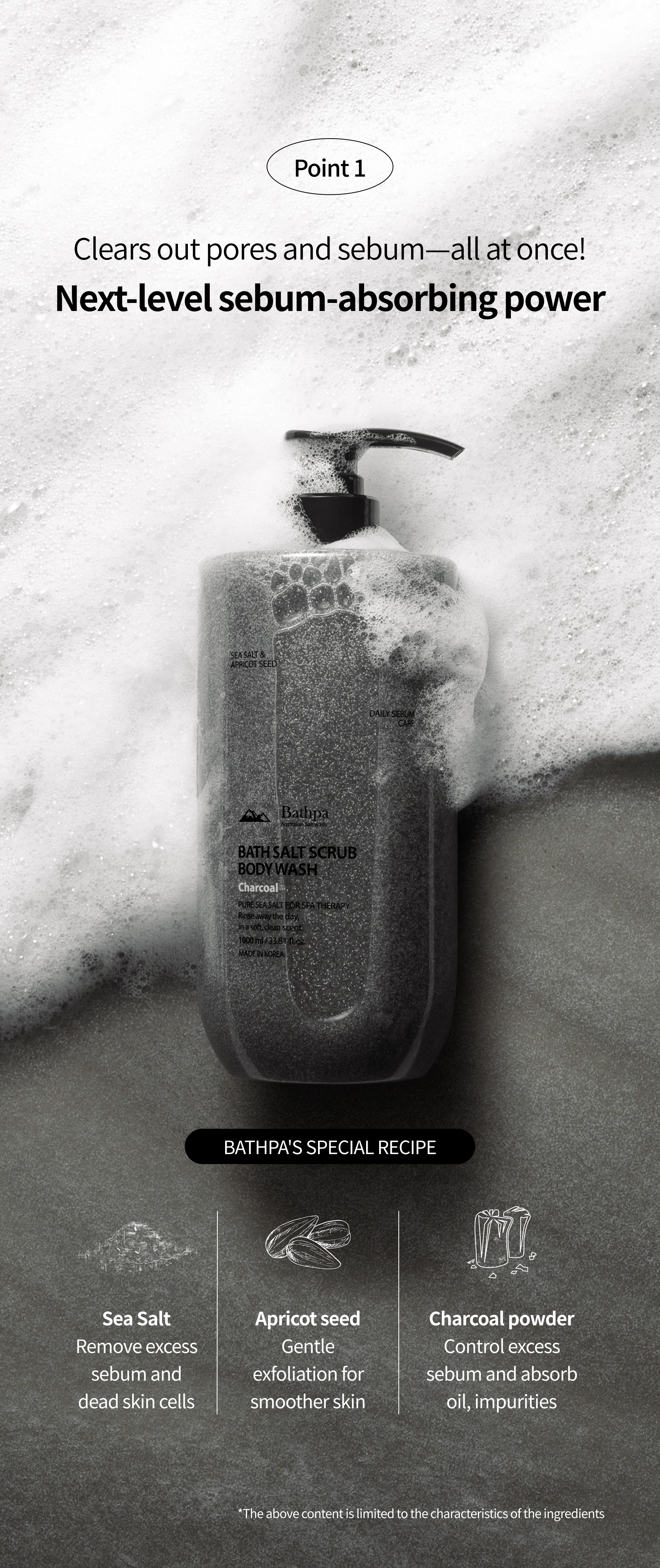 - Powerful sebum care : Charcoal powder + Sea salt + Apricot seed